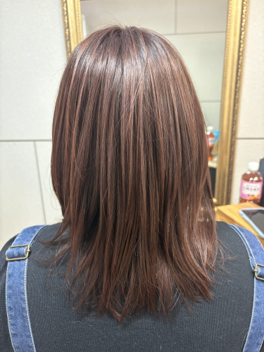 普段は暗めのカラーご希望の方が今回は明るくしたいとのこと、色味はいつもピンクが多いので明るめだとピンクは少しオレンジがかってきますので、ご本人の要望もあり、褪色も踏まえて紫要素も加えてみました。